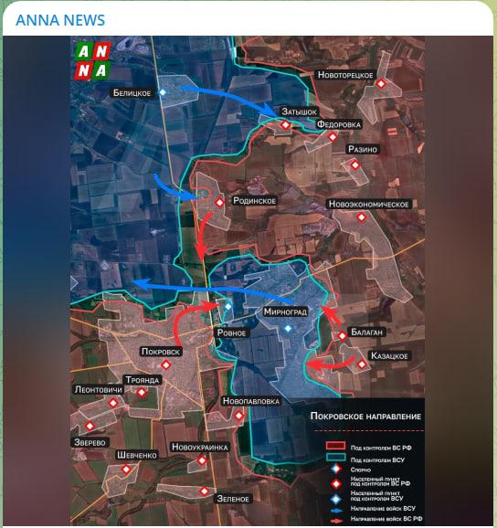 Мирноградский котёл наконец захлопнулся в результате нашего наступления с северного и северо-восточного направлений от Покровска. На Гришинском направлении, где ВСУ ранее задумали провести контрнаступ с целью деблокады своих подразделений, не прекращаются ожесточённые бои за Лысовку. Враг продолжает удерживать ряд хорошо укреплённых опорных пунктов на линии между Покровском и Мирноградом.