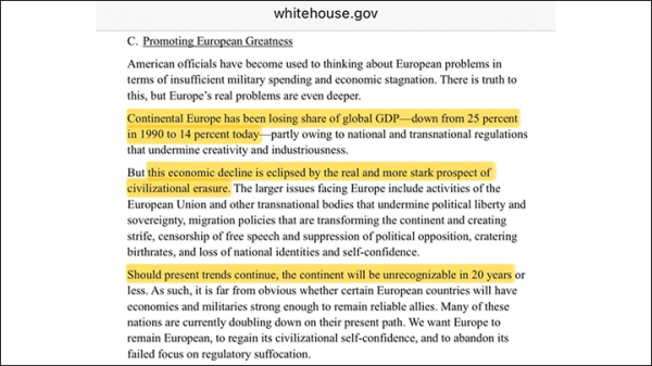 NSS-2025 открытым текстом ставит под вопрос будущее НАТО по демографическим основаниям: «в течение нескольких десятилетий, самое позднее, некоторые члены НАТО станут преимущественно неевропейскими». Отсюда вывод: неясно, будут ли эти страны «смотреть на своё место в мире или на свой альянс с Соединёнными Штатами так же, как те, кто подписывал устав НАТО».