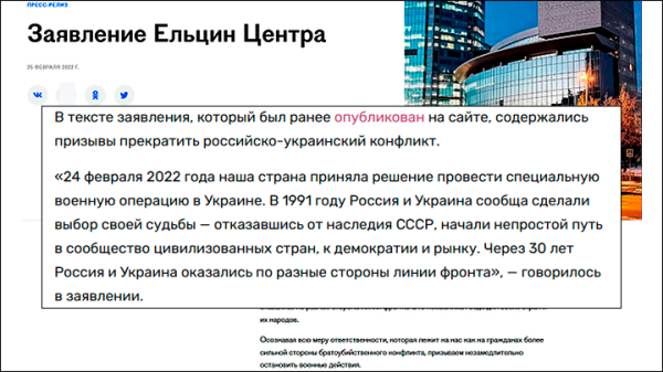 Тот же «Ельцин Центр», к примеру, призывал 25 февраля 2022 года остановить «братоубийственную» войну на Украине и «незамедлительно остановить военные действия».