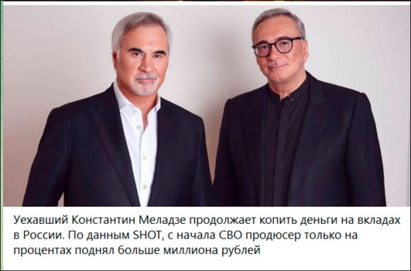 Тем временем его русские бизнес-активы демонстрируют уверенный рост. Так, в октябре 2024 года Меладзе провёл реорганизацию своей компании «Меладзе мьюзик», переоформив её на свой грузинский паспорт вместо украинского.