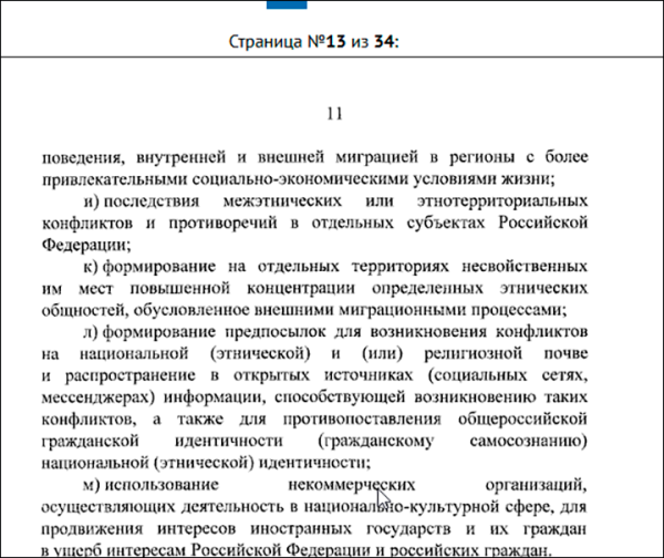 В документе есть целый блок, продолжающий уже описанное в Концепции миграционной политики. И посвящён он вызовам, с которыми столкнулась страна. В частности, в качестве угрозы воспринимается существенное изменение этнического состава того или иного региона, что неминуемо может повлечь за собой конфликты с применением насилия. Это положение особенно внимательно следует прочитать властям крупных мегаполисов и иных регионов – реципиентов миграции.