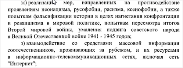 Значительное место отводится противодействию распространяющейся в мире русофобии. Причём наряду с искажением правды о Великой Отечественной войне и ущемлением прав граждан России «по паспорту» она признаётся в том числе и как притеснение русских по национальному признаку. И подобная трактовка даёт нашей стране значительно большие возможности по защите русского и русскоязычного населения на всём пространстве бывшего СССР.