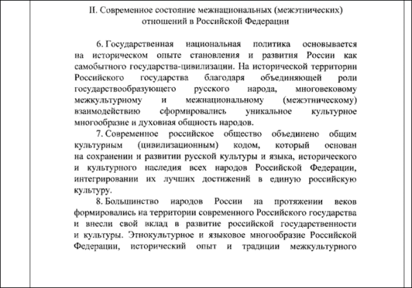 Кроме того, предыдущий документ принимали задолго до поправок в Конституцию, которые подтвердили государствообразующий статус русского народа. Соответственно, в тексте старой стратегии национальной политики о русских как об этнической основе нашего государства не говорилось ничего. Разве что отмечалось, что «общероссийская гражданская идентичность основана на сохранении русской культурной доминанты, присущей всем народам», населяющим Россию. Всё.