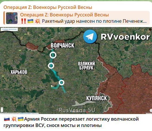 Приходят сообщения об ударе по дамбе Печенежского водохранилища на Украине. Через эту дамбу проходит одна из дорог от Харькова на Волчанск (через юг с большим крюком), Великий Бурлук и Купянск, где сейчас идут активные бои. Вероятнее всего, начался новый этап изоляции района боевых действий. Разрушения грандиозные.