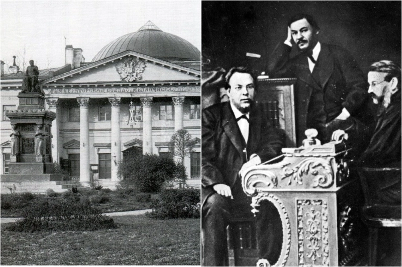 Здание военно-медицинской академии с памятником Я. Ф. Виллие; Профессора Императорской медико-хирургической академии (ИМХА): Сергей Боткин, Иван Сеченов и Венцеслав Леопольдович Грубер. Фото: Коллаж АиФ