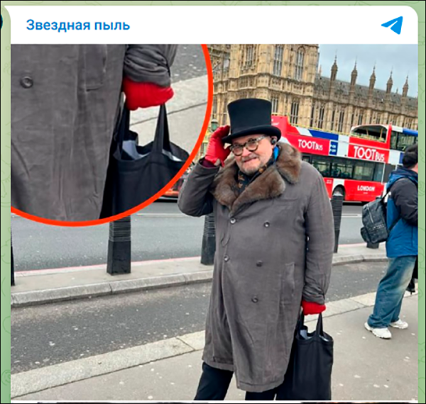 В начале февраля во время визита в Лондон экс-ведущий появился в цилиндре, сером пальто, которое с трудом сходилось на животе, дополнив образ красными перчатками и чёрной сумкой-авоськой.Скриншот с ТГ-канала «Звёздная пыль»