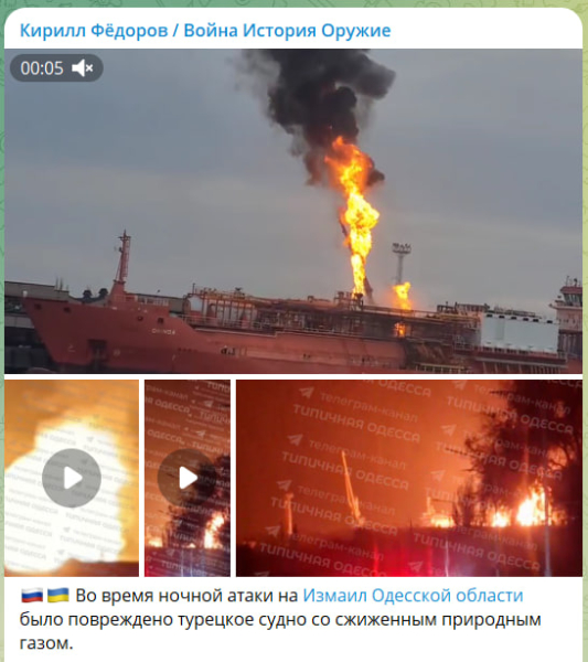 Как сообщил военблогер Кирилл Фёдоров, во время ночной атаки на Измаил Одесской области было повреждено турецкое судно со сжиженным природным газом. Что с ним на деле произошло, неизвестно, но кадры полыхающих огненных столбов выглядят эпично. Что-то подсказывает, что если бы у стран НАТО была возможность обвинить во всём Россию, они бы это давно сделали, однако они продолжают молчать, и только одесский гаулейтер сыпет угрозами.