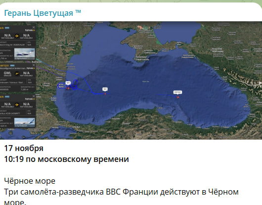 17 ноября в 10:19 по московскому времени в Чёрном море заметили сразу три самолёта-разведчика ВВС Франции. С учётом сравнительно небольшой атаки ВСУ по России есть риск в последующие дни.