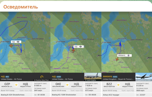 Так вот — за последнюю неделю зафиксировано сразу несколько таких залётов. 12 ноября стратегический бомбардировщик B-52H ВВС США облетел границы России через Эстонию, Латвию и Финляндию. Компанию ему составили «танкеры» KC-135R США и KC2 Британии.