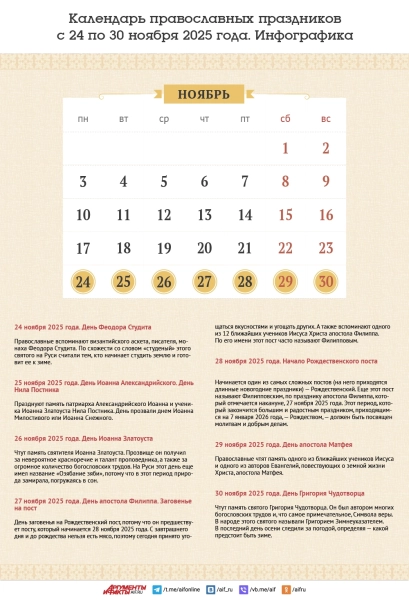 На неделю 24-30 ноября 2025 года приходится начало Рождественского поста. Также чтут память святителя Иоанна Златоуста. На Руси этот день еще имел название «Озябание зяби», потому что в этот период природа замирала, погружаясь в сон.