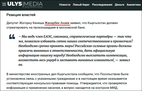 После недавнего накрытия силовыми структурами в московской «этнической» бане нелегальных мигрантов — выходцев из Киргизии Акаев выступил с резкой критикой наших правоохранителей. Потребовал разобраться и привлечь виновных к ответственности. Вот только единственными виновными там были те, кто нарушал миграционное законодательство принимающей стороны. Призвать соотечественников неукоснительно соблюдать нормы права России Акаев и ему подобные почему-то не спешат.