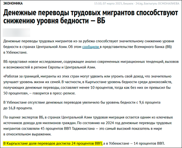 Экономики стран Средней Азии тотально зависят от трудовой миграции в Россию. Скриншот страницы 24.kg