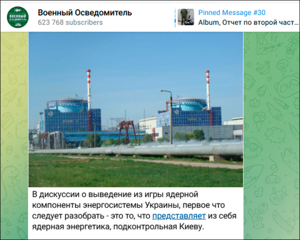 Возможность «вывода из игры» украинских АЭС обсуждается не первый год. Чисто военная выгода от таких ударов очевидна, но всё упиралось в тяжёлые политические последствия. Скриншот: ТГ-канал «Военный осведомитель»