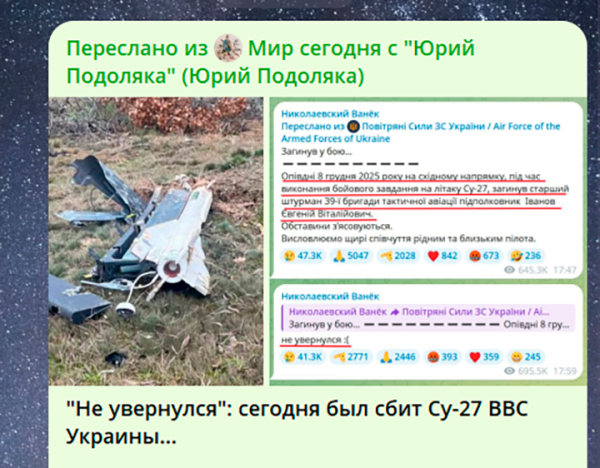Любопытно, что украинские ресурсы отмечают, что украинский лётчик «не смог увернуться», – очевидно, от ракеты. И тут, конечно, логично предположить, что ракета была выпущена дальнобойным зенитным комплексом С-300/С-400 или одним из наших истребителей.