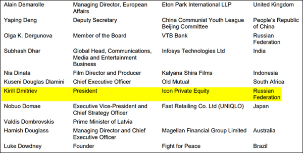 Профессиональные его качества Кирилла Дмитриева получили в своё время признание у глобалистов: в 2010 году его включили в список «молодых глобальных лидеров» Давосского форума.