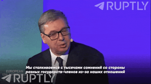 «Я не собираюсь оправдываться за то, что разговариваю с кем-то», — Вучич о своих отношениях с Москвой и Пекином и критике со стороны ЕС. Видео: Ruptly