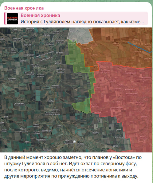 ВС России, не желая прорывать раз за разом глубоко эшелонированную оборону противника, которую ВСУ выстроили перед Ореховом и Гуляйполем, ещё с прошлого года заходят всем этим «рубежам» в тыл. После освобождения Угледара мы неотвратимо идём на запад на этом участке ЛБС.