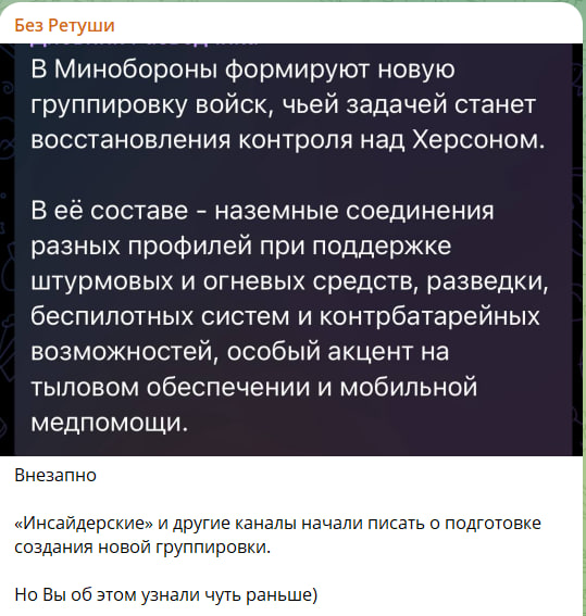 Херсону приготовиться. Многие считают, и в принципе это логично, что форсировать Днепр будет невозможно. Но все острова уже под нашим контролем, и, зацепившись за промышленную зону, а после создав небольшой плацдарм, – всё станет возможным, а может, происходит уже прямо сейчас. <…> Те, кто думали, что появление новой группировки войск – это ложь, скоро будут удивлены. <…> Удар по Харькову будет. Удар по Херсону будет. А ещё будет удар куда больнее,