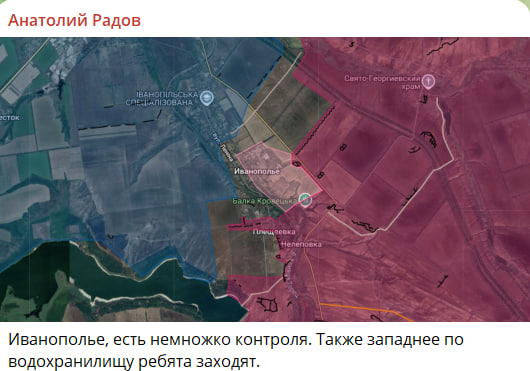 Как отметил Радов, фиксируется контроль наших бойцов над частью Иванополья. Западнее по водохранилищу наши ребята заходят. При этом, согласно данным мониторингового ресурса «Сливочный каприз», ВС России уже заняли центральную часть Иванополья и взяли под контроль позиции севернее Клебан-Быка. Около Константиновки ВСУ атаковали позиции ВС России в Ступочках и Предтечине.