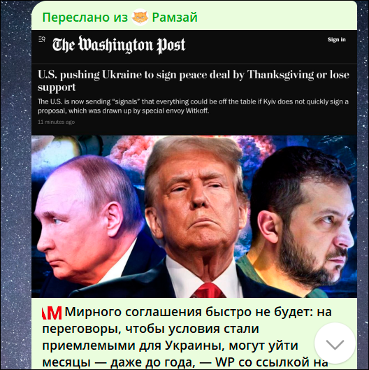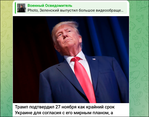 Трамп ультимативно требует от Зеленского согласиться на план в течение нескольких дней. В предыдущий раз, когда американский президент вёл себя подобным образом, он снял Украину с американских субсидий. Не добивается ли он чего-то подобного и сейчас? Скриншот: ТГ-канал «Военный Осведомитель».