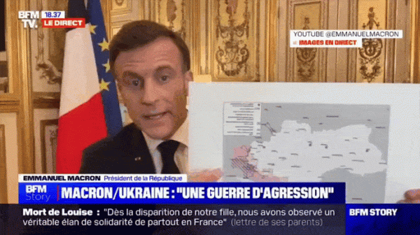К слову о союзниках: надёжный и компетентный партнёр Украины — президент Франции Эммануэль Макрон — объясняет ситуацию на фронтах, держа украинскую карту вверх ногами. Источник: ТГ-канал «Царьграда».