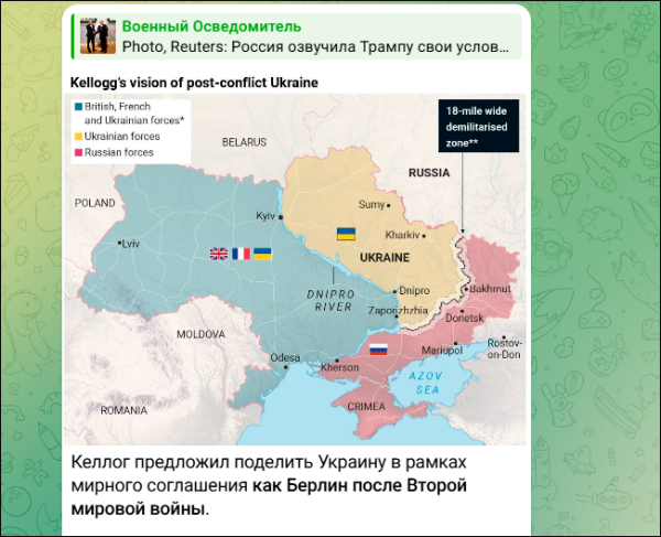 Нетрудно заметить, что нынешние предложения плана «28 пунктов» в части раздела территорий просто повторяют план украинского лоббиста Кита Келлога весны текущего года, из которого убрали ввод европейских войск на запад Украины. Скриншот ТГ-канал «Военный Осведомитель».