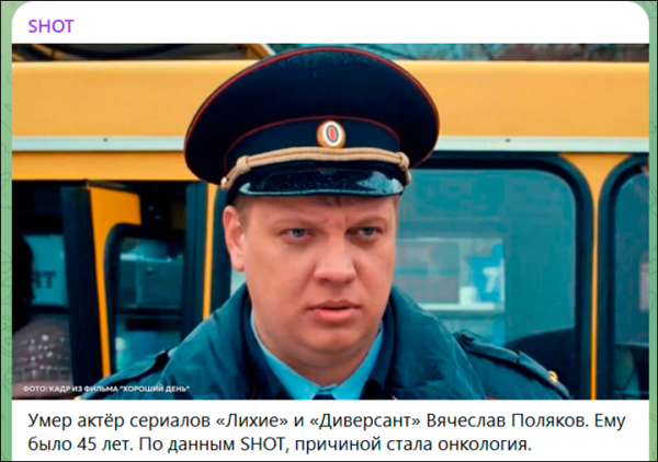 Спустя короткое время ещё одна утрата. Умер актер Вячеслав Поляков. Он скончался на 46-м году жизни. Зрители знают его по ролям в сериалах «Лихие» и «Диверсант». По предварительным данным, причиной смерти тоже стала онкология.