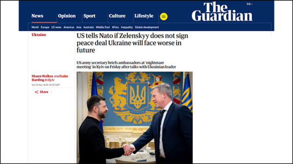 Американские чиновники сообщили союзникам по НАТО, что они рассчитывают подтолкнуть Зеленского к заключению мирного соглашения, иначе «в будущем его ждёт гораздо худший вариант». Скриншот: The Guardian