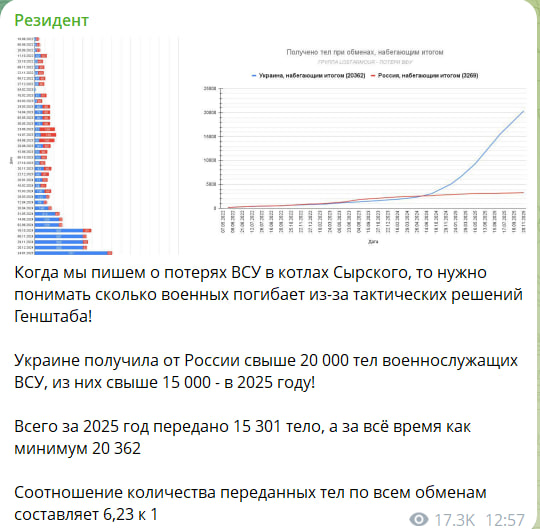 После безумных приказов Зеленского ВСУ уже 17 дней продолжают ползучее наступление – самоубийственные попытки прорваться к Купянску и реке Оскол в Харьковской области, чтобы деблокировать свои окружённые войска. Противник потерял множество техники и пехоты, но продолжает переть в пешем порядке. Штурмовые отряды 6-й армии продолжают уничтожение окружённой группировки противника в районе Купянска. <…> В течение прошлых суток отражены две атаки 125-й механизированной бригады ВСУ и 15-й бригады нацгвардии в районах н.п. Благодатовка и Кутьковка с целью деблокирования окружённых формирований и прорыва к реке Оскол,