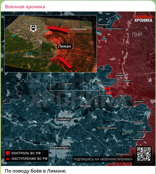 Продолжается наш прорыв в направлении Лимана и бои за сам город. Оборона противника пробита через Масляковку. Наши закрепились на окраинах – это серьёзный прогресс, однако радоваться, предупреждает «Военная хроника», рано: