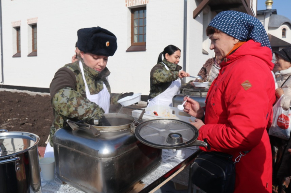 После молебна около храма Максима Исповедника всех желающих ждала полевая кухня – гречневая каша, ароматный чай, пряники.