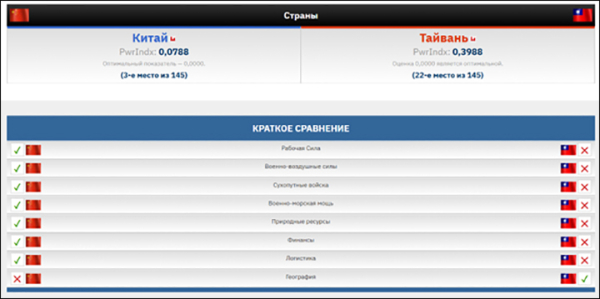 Преимущество у Тайваня – лишь его география. Скриншот страницы сайта globalfirepower.com. Автоперевод
