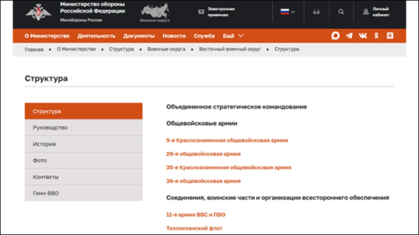 Структура Восточного военного округа. Скриншот страницы сайта mil.ru