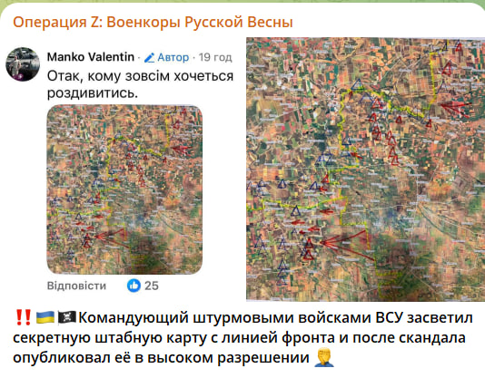 Но дальше ещё лучше. Он случайно слил секретные карты украинского Генштаба в высоком разрешении, которые, мягко говоря, сильно отличаются от официальных сводок. Теперь украинцы спорят — предательство или глупость. Сам он прокомментировал свою публикацию в социальных сетях словами: «Тем, кому совсем хочется рассмотреть». Украинские СМИ сообщили, что карты оказались в том числе в Tik-Tok.