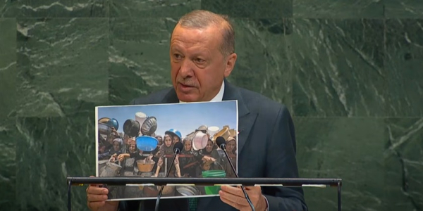 Вскоре после Трампа Эрдоган вышел на трибуну ООН. Большую часть выступления он посвятил обвинениям Израиля, причем не только за войну в Газе. Действия ЦАХАЛа Эрдоган назвал геноцидом. Он заявил, что в Газе нет войны, а есть «целенаправленное убийство невинных мирных жителей». «Я покажу вам фото, которое изображает картину ежедневной жизни в Газе», — с этими словами Эрдоган поднял распечатку фото: толпа людей протягивает кастрюли и тазы на пункте раздачи продовольствия. «Просто спросите себя: разве для этого может быть разумная причина в 2025 году?», — задался риторическим вопросом Эрдоган и рассказал, что его сердце кровоточит.