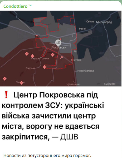При этом противник включил не просто антикриз – «пошли новости из потустороннего мира пэрэмог». В частности, 7-я штурмовая бригада противника заявила: «ВСУ зачистили центр Покровска. У врага не получается закрепиться». В качестве «доказательства» они опубликовали видео с дрона, который пролетает над разрушенным частным сектором и бьёт в одну из построек. На этом всё. Наши военкоры оперативно опровергли вбросы.