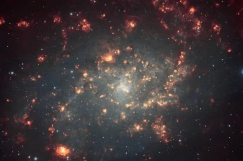 «Экспериментальная обработка материала неожиданно проявила интересные детали в рукавах галактики. Применение узкополосного фильтра показало „звездные ясли“ и водородные комплексы (они оранжево-красного цвета)», — сказано в публикации.